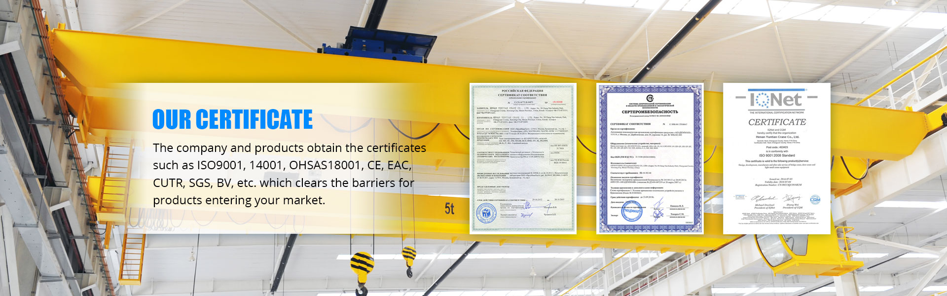 Ми можемо надати Вам всі види промислових кранів від 0,25 до 900 тонн, пройти GB / T 19001-2000 ISO 9001: 2000, GB / T 24001-2004 ISO 9001: 2004, GB / T 28001-2001, OHSAS 18001: 1999, CE, GOST, SGS, TUV, BV і так далі.